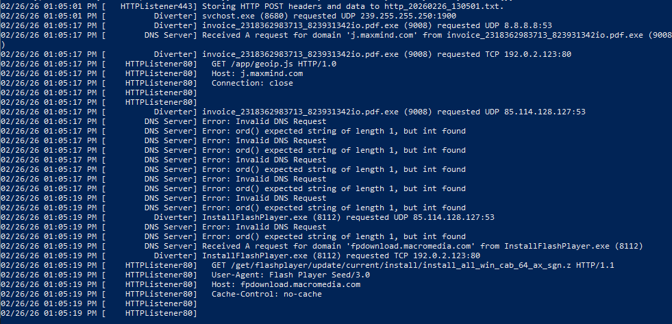 A secondary process, InstallFlashPlayer.exe, was observed making HTTP requests to fpdownload.macromedia.com, which tells me that the original sample likely dropped or executed a second-stage payload, meaning a multi-stage execution architecture was in use.